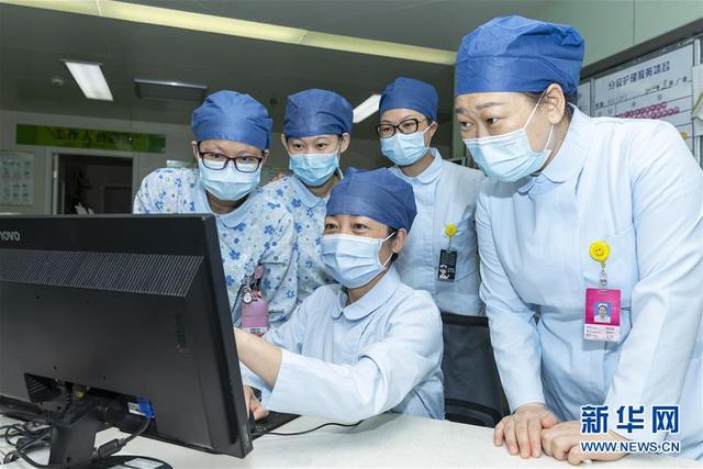 海軍軍醫(yī)大學(xué)第二附屬醫(yī)院急診、重癥醫(yī)學(xué)科護(hù)士長(zhǎng)陳靜(坐者)與危重癥科護(hù)士交流新上線的醫(yī)囑信息系統(tǒng)使用情況(8月5日攝)。新華社發(fā)(汪輝 攝)