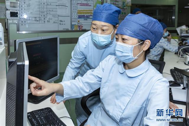 海軍軍醫(yī)大學(xué)第二附屬醫(yī)院急診、重癥醫(yī)學(xué)科護(hù)士長(zhǎng)陳靜(右)通過監(jiān)控查看病人情況(8月5日攝)。新華社發(fā)(汪輝 攝)