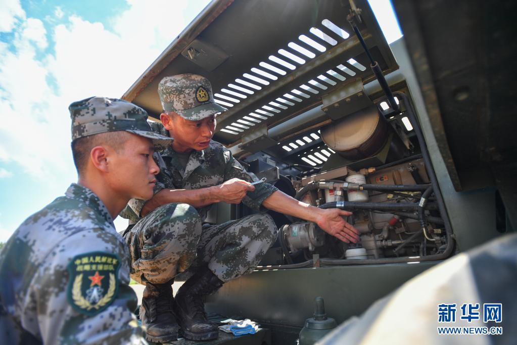 戰(zhàn)略支援部隊(duì)某大隊(duì)一級軍士長高玉華(右)現(xiàn)場指導(dǎo)排除工程機(jī)械故障(7月23日攝)。新華社記者 陳澤國 攝