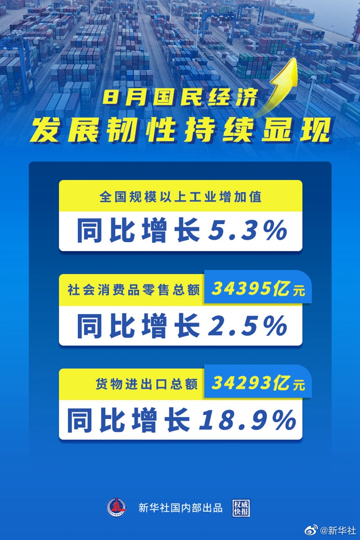 國家統(tǒng)計局15日發(fā)布的數(shù)據(jù)顯示,8月份,全國規(guī)模以上工業(yè)增加值同比增長5.3%,兩年平均增長5.4%;社會消費品零售總額34395億元,同比增長2.5%,兩年平均增長1.5%;貨物進出口總額34293億元,同比增長18.9%,國民經(jīng)濟發(fā)展韌性持續(xù)顯現(xiàn)。(記者魏玉坤、謝希瑤)