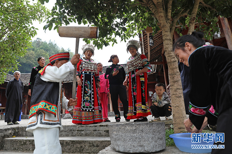 在彭水自治縣鞍子鎮(zhèn)羅家坨苗寨,當(dāng)?shù)卮迕裾诩磁d演唱“打糍粑”的苗族民歌。動(dòng)聽的歌聲傳遍山野,表達(dá)著實(shí)現(xiàn)全面小康后當(dāng)?shù)孛玎l(xiāng)兒女對(duì)幸福生活的贊美。新華網(wǎng)發(fā)(趙勇 攝)