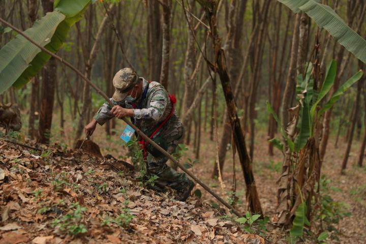 日前,記者跟隨段二文等人,走了一段他認(rèn)為很普通的巡邊路。當(dāng)天,熟悉路況的段二文走在最前面,遇到不好通過的地方,他拿著砍刀幾下就清除了障礙。隨后穿越一片橡膠林,經(jīng)過一條用來區(qū)分國境線的石板路,抵達最終的目的地——S144-2號界樁。