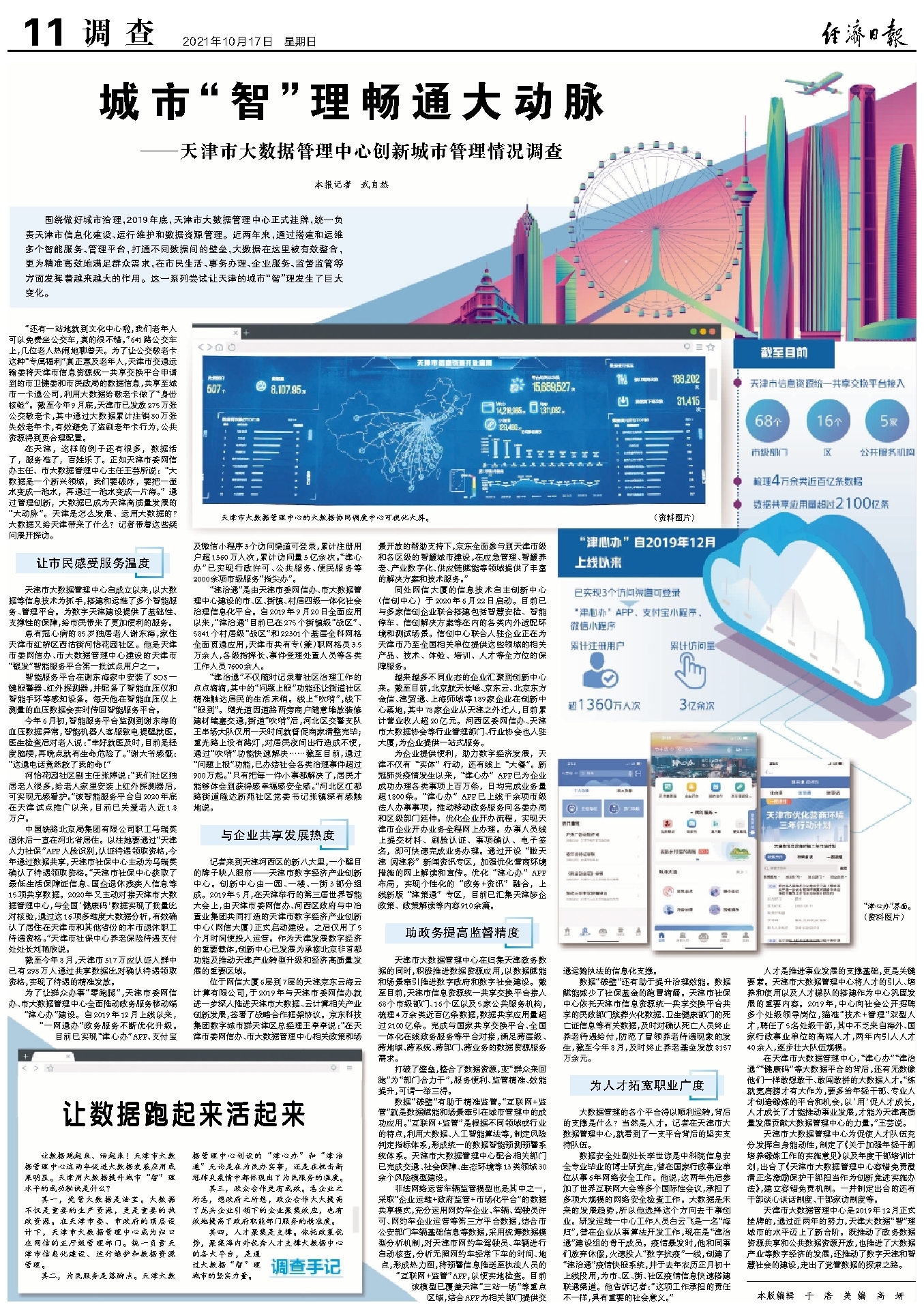 圍繞做好城市治理,2019年底,天津市大數(shù)據(jù)管理中心正式掛牌,統(tǒng)一負(fù)責(zé)天津市信息化建設(shè)、運(yùn)行維護(hù)和數(shù)據(jù)資源管理。近兩年來,通過搭建和運(yùn)維多個(gè)智能服務(wù)、管理平臺,打通不同數(shù)據(jù)間的壁壘,大數(shù)據(jù)在這里被有效整合,更為精準(zhǔn)高效地滿足群眾需求,在市民生活、事務(wù)辦理、企業(yè)服務(wù)、監(jiān)督監(jiān)管等方面發(fā)揮著越來越大的作用。這一系列嘗試讓天津的城市“智”理發(fā)生了巨大變化。