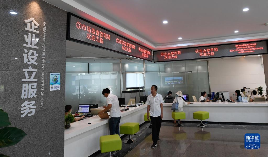 海南自由貿易港生態(tài)軟件園企業(yè)服務超市的工作人員為入園企業(yè)提供相關服務(5月31日攝)。新華社記者 楊冠宇 攝