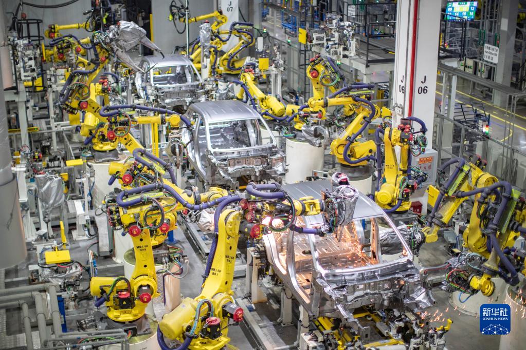 在重慶金康新能源汽車有限公司,智能化焊接機器人在進行焊接作業(yè)(4月2日攝)。新華社記者 黃偉 攝