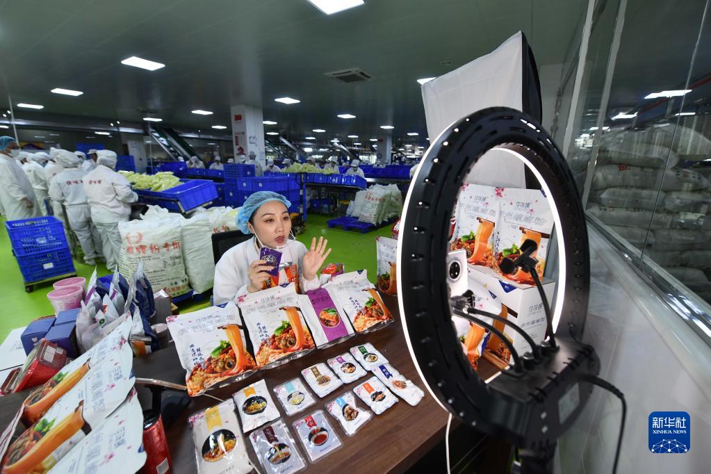 在廣西一家螺螄粉生產車間,工作人員在直播銷售螺螄粉(6月17日攝)。新華社記者 黃孝邦 攝