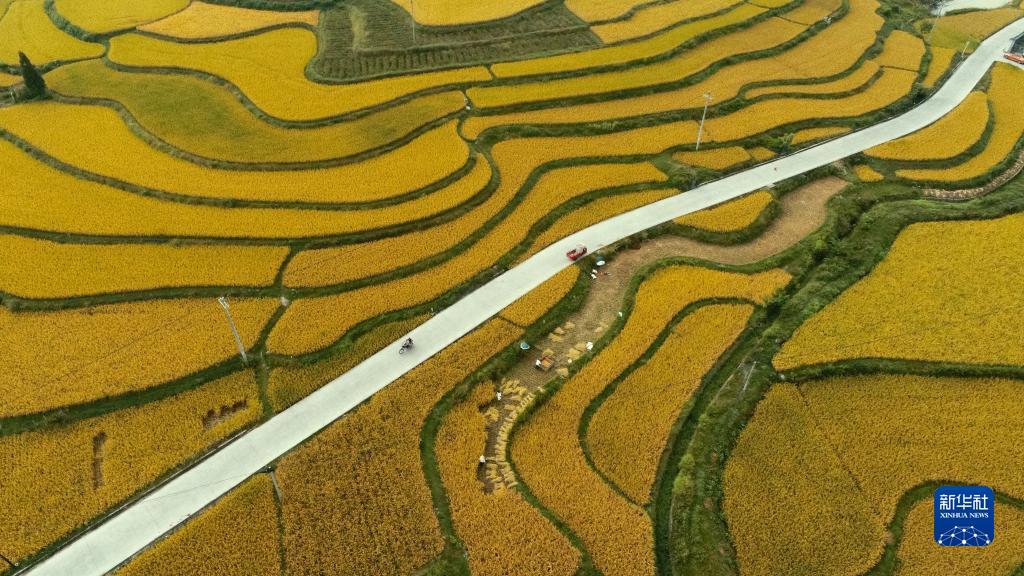 9月12日,農民在貴州省龍里縣灣灘河鎮(zhèn)金批村稻田里收獲稻谷(無人機照片)。新華社發(fā)(龍毅 攝)
