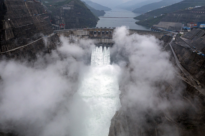 投產(chǎn)發(fā)電中的白鶴灘水電站(無人機照片)。新華社記者 江文耀 攝