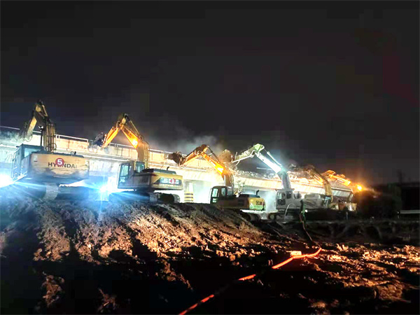 在施工現(xiàn)場(chǎng),隨著指揮員的一聲令下,50多臺(tái)設(shè)備齊裝上陣,轟隆作業(yè)。由于該兩座橋同時(shí)上跨京滬高速公路,現(xiàn)場(chǎng)作業(yè)空間有限。為確保此次拆橋任務(wù)安全順利進(jìn)行,同時(shí)降低施工影響,京滬高速公路HA4標(biāo)項(xiàng)目部對(duì)施工現(xiàn)場(chǎng)進(jìn)行詳細(xì)調(diào)查,多次組織召開專家施工方案評(píng)審會(huì),反復(fù)論證,細(xì)化橋梁拆除方案,精準(zhǔn)把控施工計(jì)劃;項(xiàng)目部領(lǐng)導(dǎo)班子和管理人員,全稱盯控,確保拆除工作萬無一失。