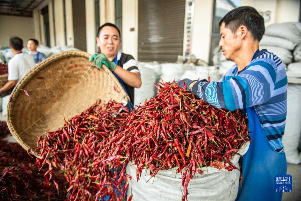 工人在遵義市新蒲新區(qū)中國(guó)辣椒城將辣椒裝袋(8月29日攝)。新華社記者 陶亮 攝