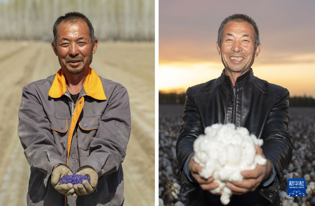拼版照片:左圖為春播時(shí)節(jié),陸高林手捧棉種站在三道溝村的棉田里(4月15日攝);右圖為秋收時(shí)節(jié),陸高林手捧棉花站在三道溝村的棉田里(10月23日攝)。新華社記者 胡虎虎 攝