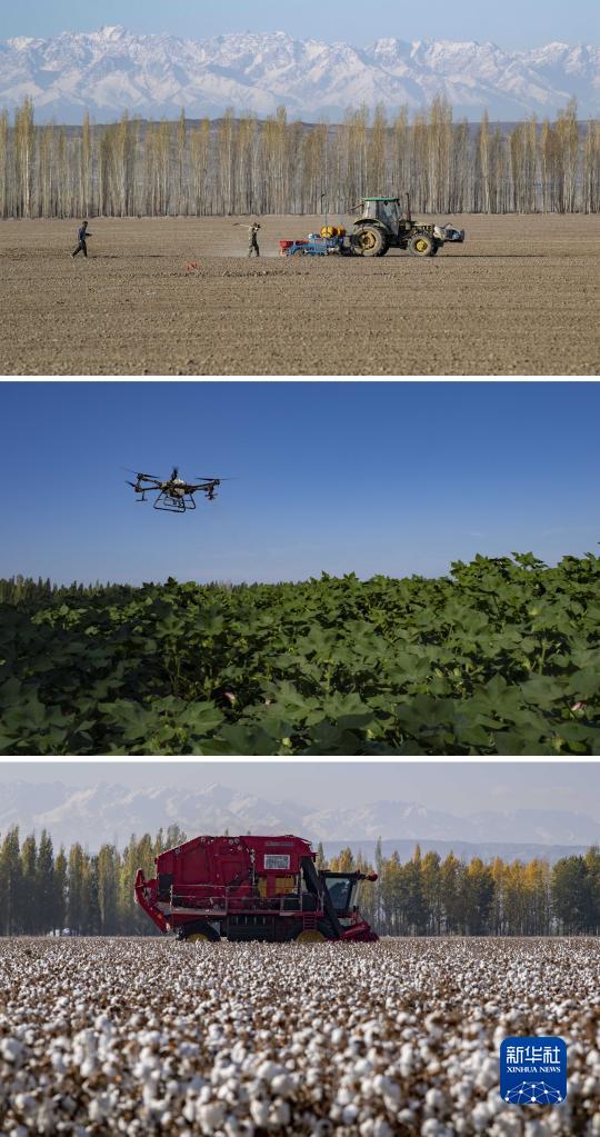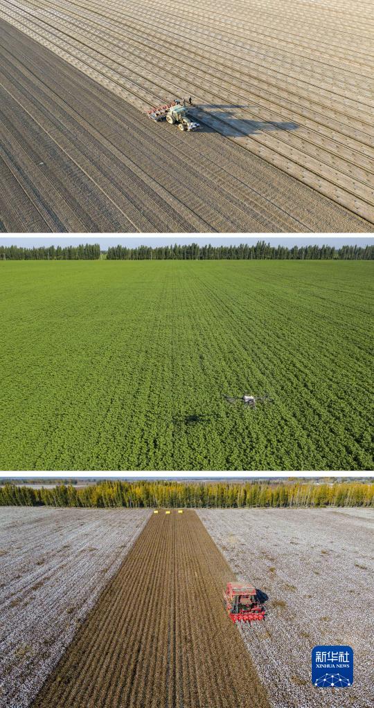 拼版照片:上圖為春播時(shí)節(jié),陸高林父子和雇來的工人一起操作機(jī)械在棉田里播種(4月15日攝);中圖為夏季田間管理時(shí),農(nóng)業(yè)植保無人機(jī)在陸高林家的棉田里打藥(7月15日攝);下圖為秋收時(shí)節(jié),陸高林雇來的采棉機(jī)在棉田里采收棉花(10月24日攝)。新華社記者 胡虎虎 攝