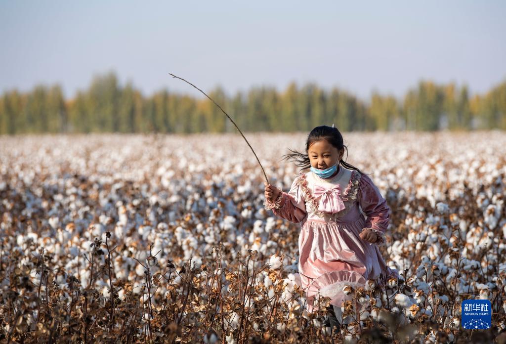 秋收時(shí)節(jié),陸高林的大孫女在一片待采收的棉田里奔跑(10月24日攝)。新華社記者 胡虎虎 攝