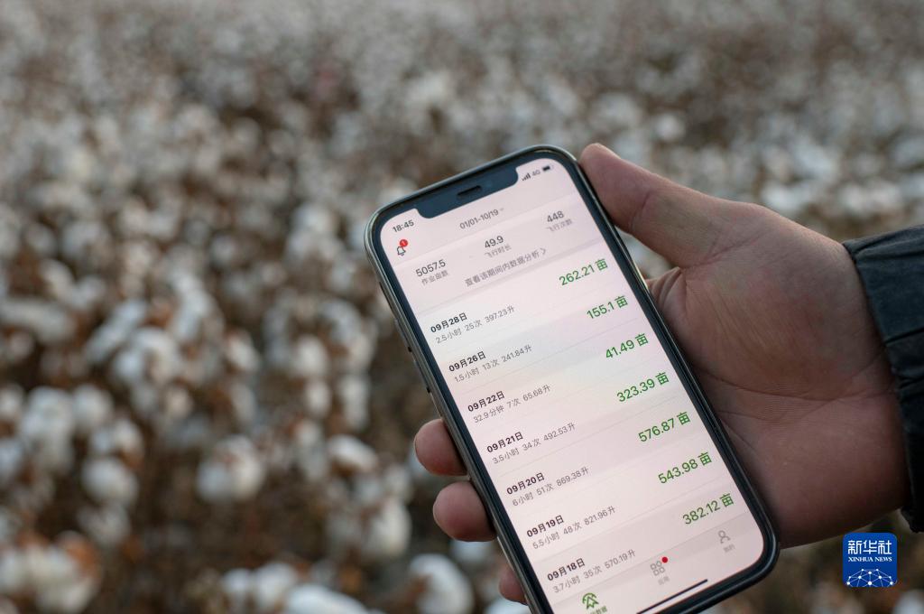 秋收時(shí)節(jié),陸德文展示自己使用無人機(jī)為自家和其他農(nóng)戶棉田打落葉劑的飛行數(shù)據(jù)(10月19日攝)。在親身感受過無人機(jī)飛防作業(yè)的便捷后,老陸家在今年8月買了一臺(tái)。新華社記者 胡虎虎 攝
