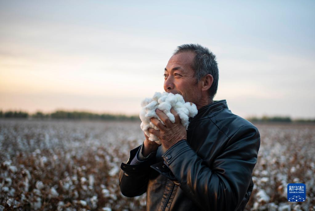 秋收時(shí)節(jié),雨過天晴,落日余暉灑落在陸高林家待采收的棉田里(10月23日攝)。新華社記者 胡虎虎 攝