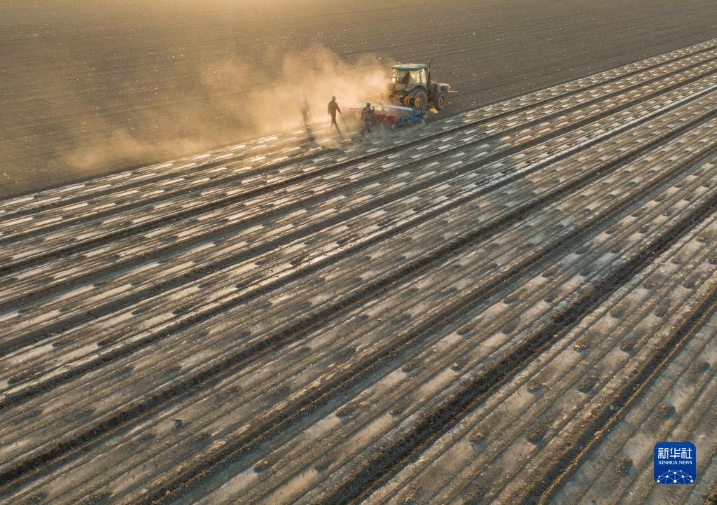 在新疆塔城地區(qū)沙灣市大泉鄉(xiāng)三道溝村,春播時(shí)節(jié),陸高林父子和雇來的工人一起操作機(jī)械在棉田里播種(4月15日攝,無人機(jī)照片)。新華社記者 胡虎虎 攝