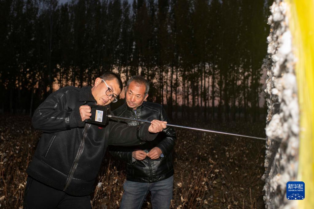 在新疆塔城地區(qū)沙灣市大泉鄉(xiāng)三道溝村,陸高林(右)和兒子陸德文使用儀器檢測(cè)已采收棉花的濕度(10月23日攝)。棉花售賣時(shí),軋花廠會(huì)對(duì)棉包進(jìn)行質(zhì)量抽測(cè),濕度過高會(huì)影響價(jià)格。新華社記者 胡虎虎 攝