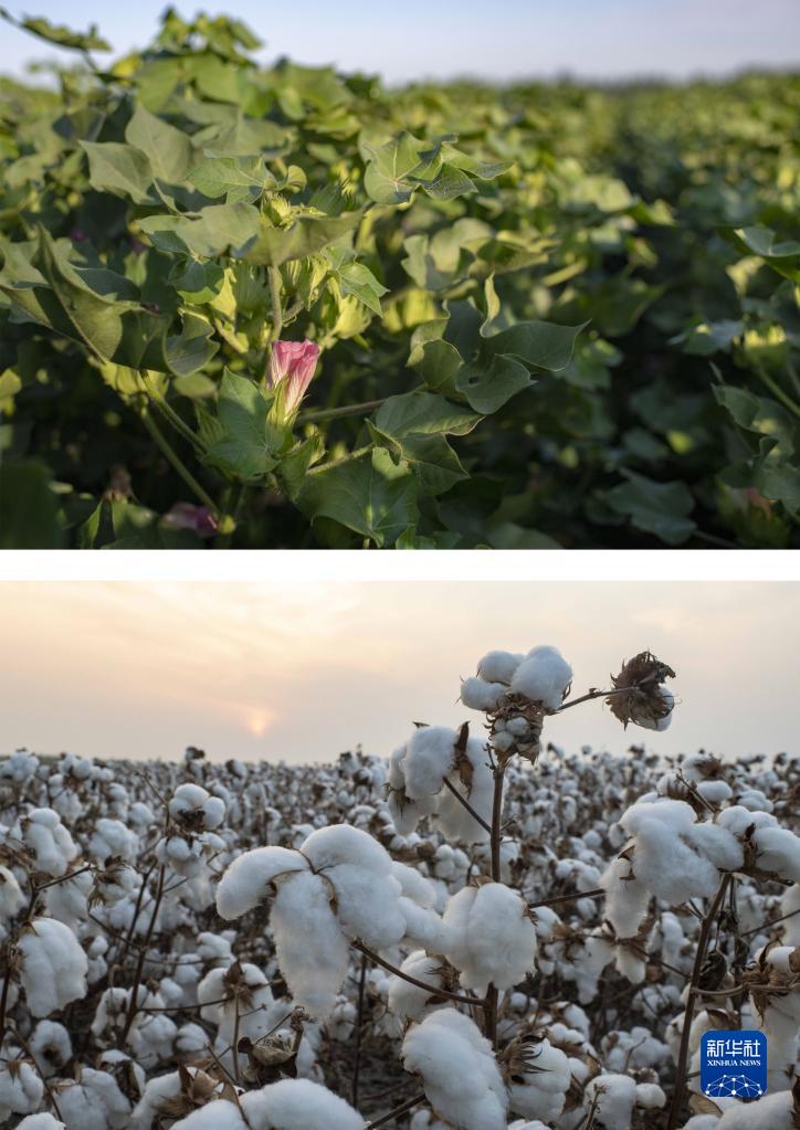 拼版照片:上圖為盛夏時(shí)節(jié)在新疆塔城地區(qū)沙灣市大泉鄉(xiāng)三道溝村拍攝的陸高林家的棉田(7月15日攝);下圖為秋收時(shí)節(jié)在相同地塊拍攝的陸高林家待采收的棉田(10月19日攝)。新華社記者 胡虎虎 攝