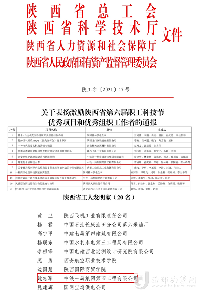 西部決策網(wǎng)訊近日,在陜西省總工會(huì)、科技廳、人社廳、國資委聯(lián)合開展的陜西省第六屆職工科技節(jié)活動(dòng)中,中鐵一局四公司機(jī)械修造廠憑借成果《隧道防水板鋪設(shè)臺(tái)車》榮獲陜西省職工優(yōu)秀創(chuàng)新成果二等獎(jiǎng),中鐵一局四公司工程技術(shù)管理部憑借成果《獨(dú)塔雙索面三跨連續(xù)半漂浮體系斜拉橋綜合施工技術(shù)研究》榮獲陜西省職工優(yōu)秀創(chuàng)新成果三等獎(jiǎng),理小路項(xiàng)目姚志軍被授予“陜西省工人發(fā)明家”稱號(hào)。
