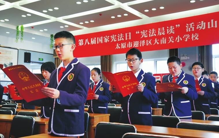 12月3日,迎澤區(qū)大南關(guān)小學(xué)開展“憲法晨讀”活動(dòng)。該校作為第八屆國(guó)家憲法日“憲法晨讀”山西分會(huì)場(chǎng),通過讓學(xué)生們朗讀憲法、收看直播等方式宣傳憲法知識(shí)。(徐浩軒 攝)