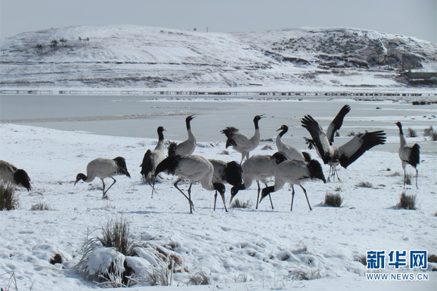黑頸鶴在白雪中翩翩起舞(11月25日攝)。新華網(wǎng)發(fā)(鄭遠(yuǎn)見(jiàn) 攝)