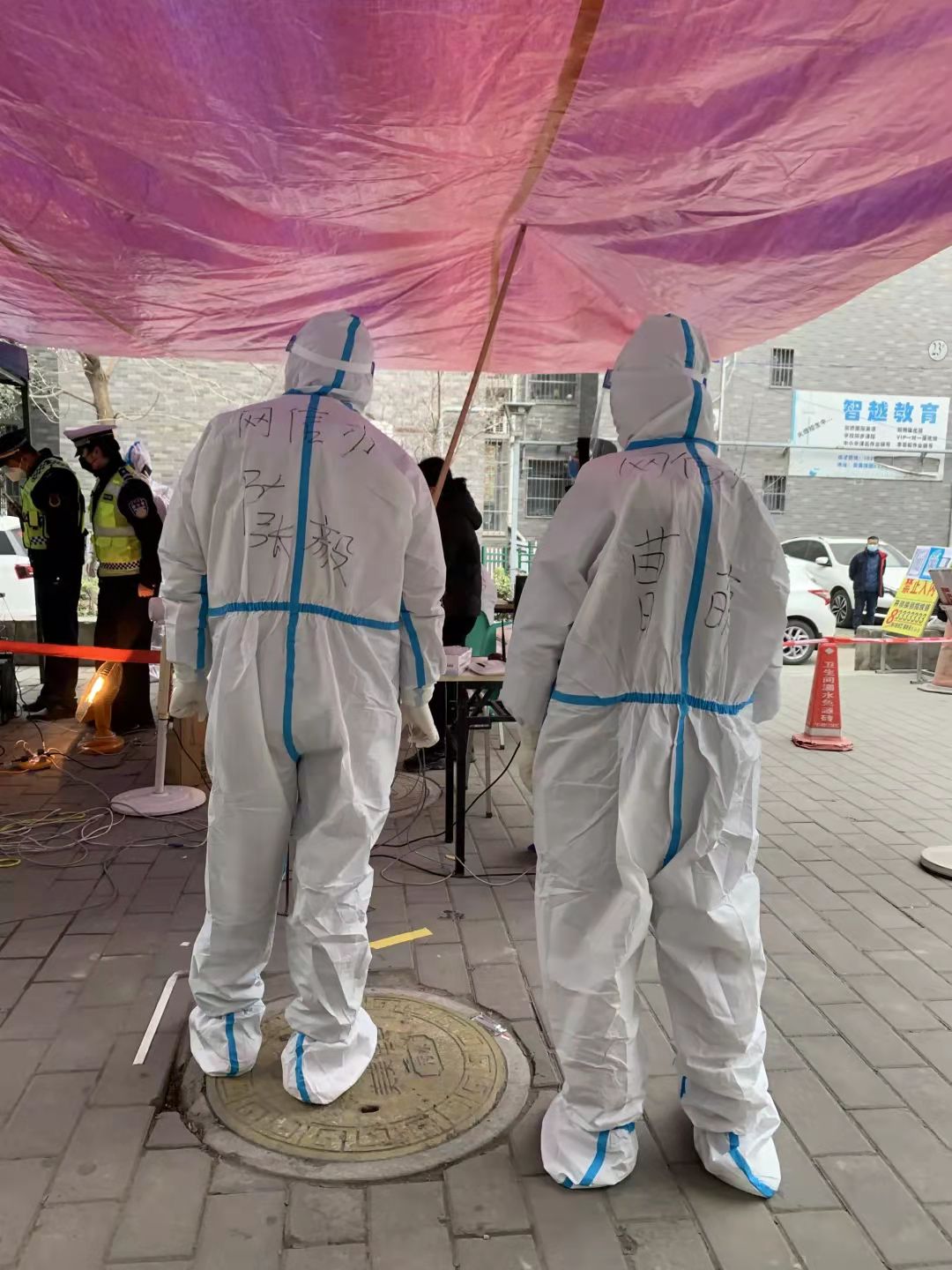 就在隔壁美美佳園小區(qū),張毅、曹萌、胡迪、劉春艷、胡振東、徐晨楊等人也早早鉆進了防護服,從學(xué)習(xí)到上崗、從開始到投入,絲毫沒有停歇,午餐時間成了唯一交流的機會,在微信群里工作的照片就像是默契的鏡子:“已看不清是誰的臉,卻能彼此知道你是誰。”