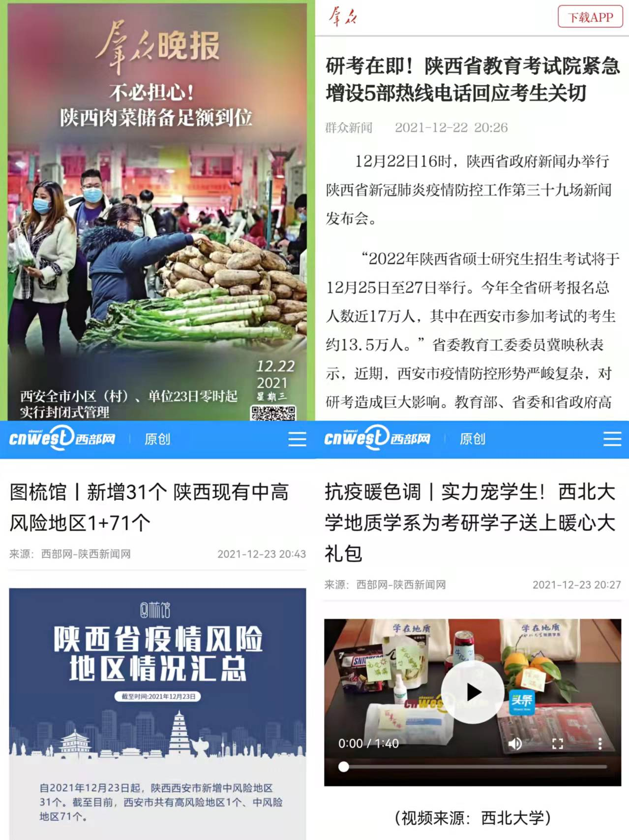 關(guān)注中小學(xué)停課不停學(xué)精彩不打折,發(fā)布忙碌在抗擊疫情一線的溫暖畫面,關(guān)切疫情之下的研究生考試……群眾新聞網(wǎng)、西部網(wǎng)、西安發(fā)布等省市重點(diǎn)網(wǎng)絡(luò)媒體也紛紛響應(yīng)倡議,深入一線挖掘戰(zhàn)疫身邊的真善美,用暖視頻、暖照片、暖文字驅(qū)散人民群眾在冬日里的寒冷與疫情中的陰霾。