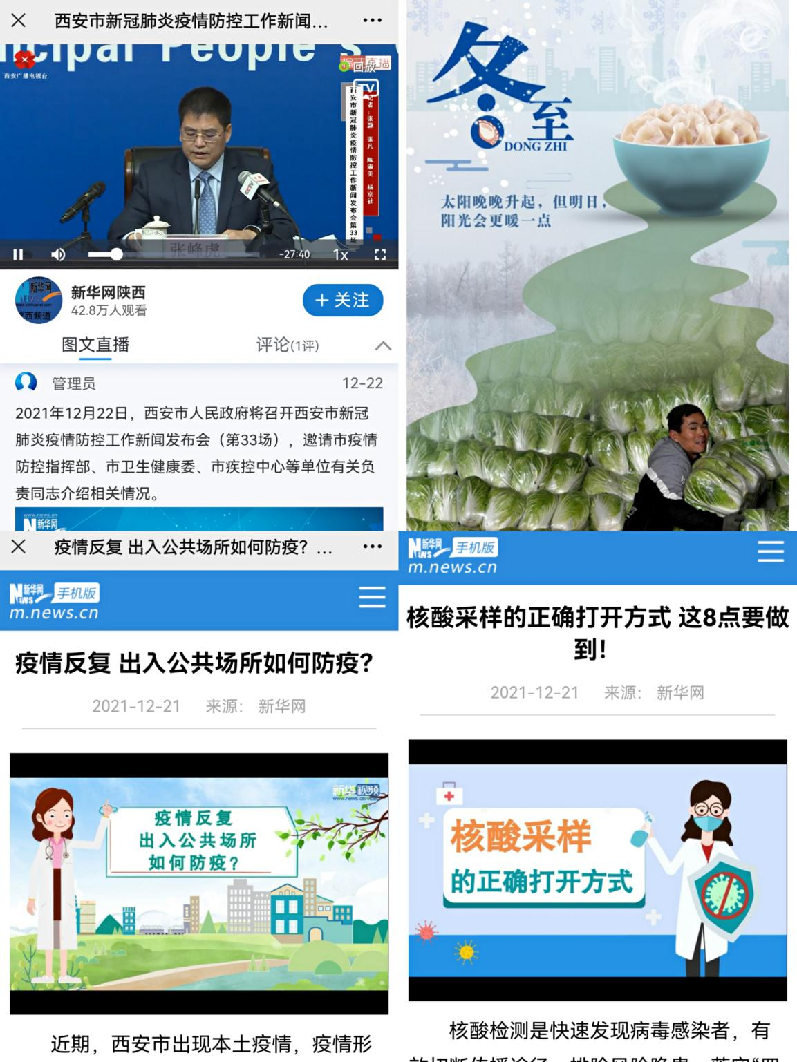 借助MG動畫短視頻手段,新華網(wǎng)第一時間向網(wǎng)民提供出入公共場所如何防疫、核酸采樣的正確打開方式等即時服務(wù)資訊;持續(xù)關(guān)注西安市新冠肺炎疫情防控工作,多平臺連續(xù)直播數(shù)場新聞發(fā)布會,為網(wǎng)民提供全方位資訊服務(wù);冬至當(dāng)天,制作暖心海報,冬已至,春可期,愿長安常安!