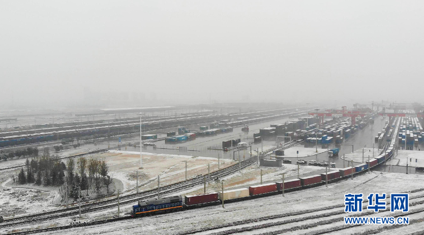 12月25日,X9003次中歐班列在雪中裝運(yùn)完畢,駛出西安國際港站。馬澤旭 攝