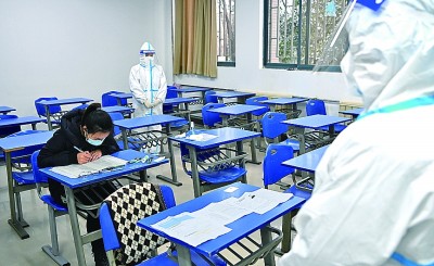 12月25日,西安外國(guó)語(yǔ)大學(xué)考點(diǎn)隔離考區(qū),監(jiān)考人員在單人隔離考場(chǎng)監(jiān)考。新華社記者 劉瀟攝