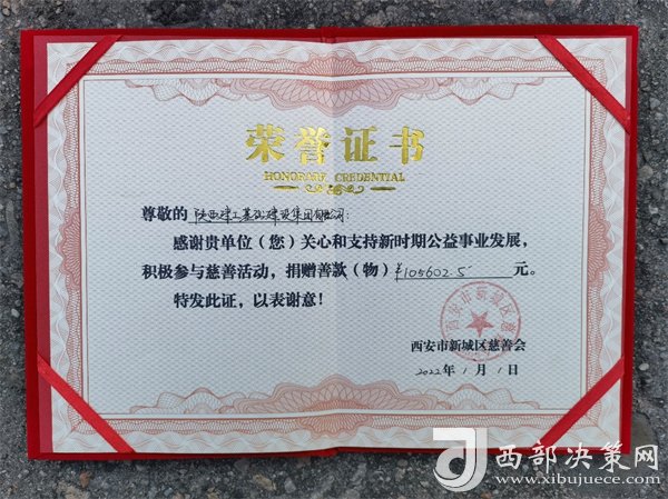 西安市新城區(qū)慈善協(xié)會向陜建基礎(chǔ)集團(tuán)頒發(fā)支持公益事業(yè)發(fā)展,積極參與慈善活動的榮譽(yù)證書。