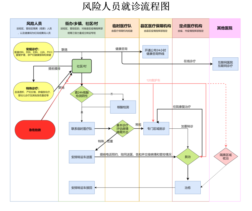 有急診搶救醫(yī)療需求的風(fēng)險人員,直接撥打120急救電話,同時通知社區(qū)(村)工作人員對接120救護(hù)車、填寫人員交接單,由120救護(hù)車聯(lián)系風(fēng)險人員醫(yī)療保障醫(yī)療機(jī)構(gòu)、定點醫(yī)療機(jī)構(gòu),或就近送至具備相應(yīng)診療能力的醫(yī)療機(jī)構(gòu)。診療結(jié)束后,醫(yī)療機(jī)構(gòu)聯(lián)系社區(qū)(村)由縣區(qū)轉(zhuǎn)運專班“點對點”接回。