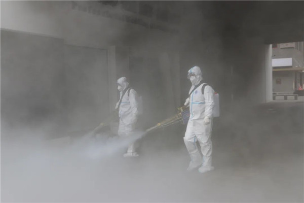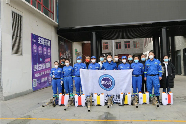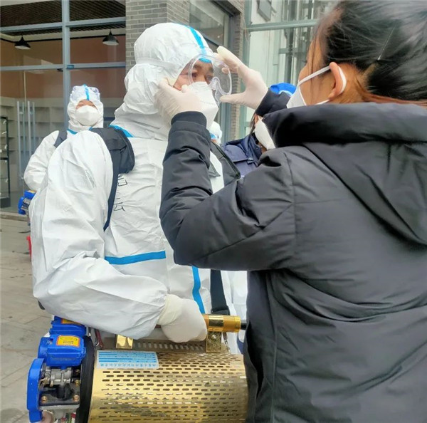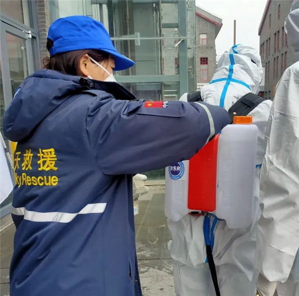 榆林藍天救援隊迅速穿戴好防護服準備就緒,隊友們互相對照檢查防護服穿著是否規(guī)范、彌霧機佩戴是否安全、消殺區(qū)域的配合等事項。
