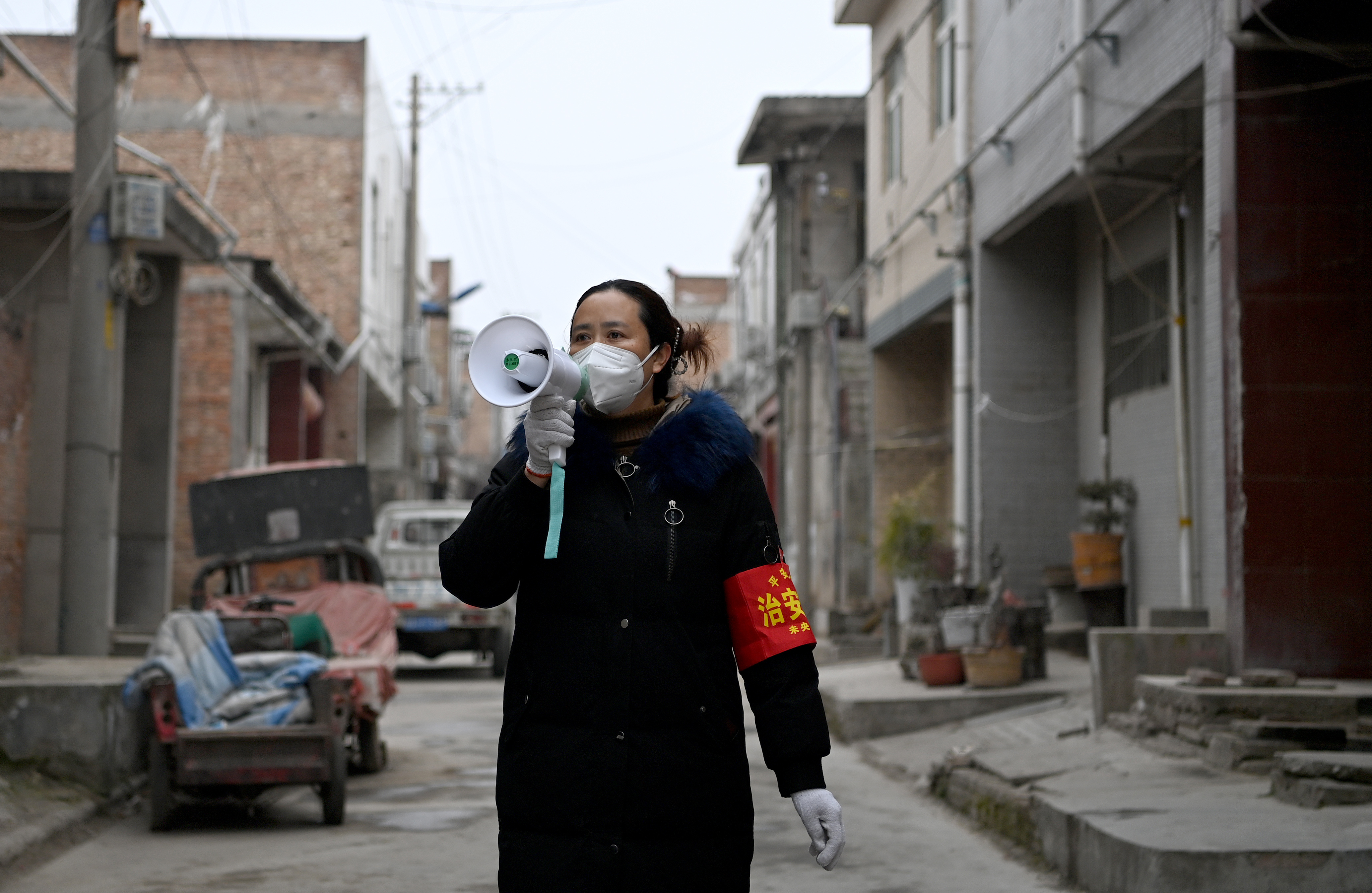 1月7日,西唐寨村志愿者在呼喊防疫提醒。