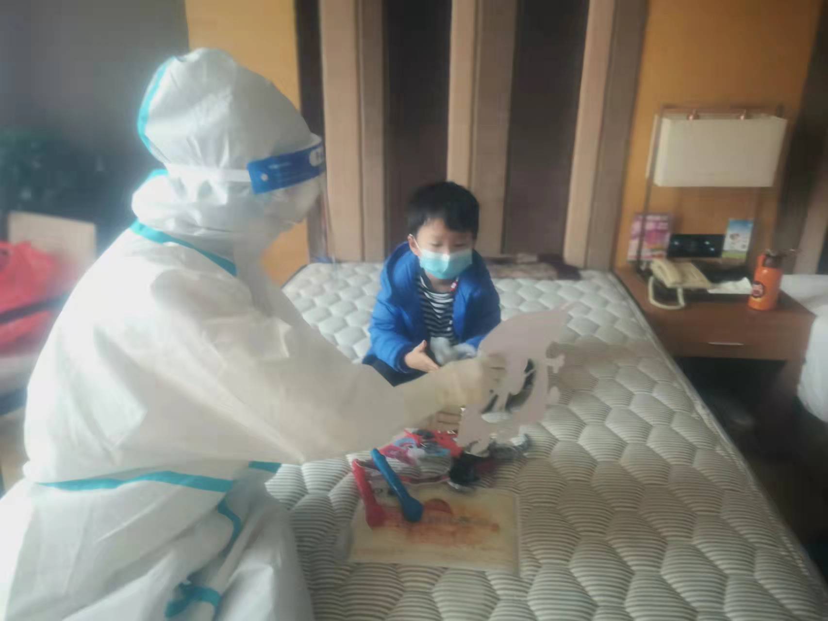 隔離在酒店的豆豆連續(xù)多輪的核酸采集均為陰性,在長(zhǎng)安區(qū)醫(yī)院的醫(yī)護(hù)人員劉列平和常芬照看陪伴下,他每日都會(huì)和爸爸、媽媽視頻聊天。
