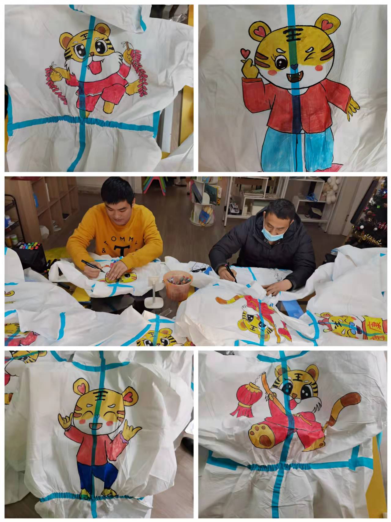 年輕人坐在一起“頭腦風(fēng)暴”,說干就干,思考、設(shè)計出了虎年主題的防護服系列圖案。吳捷說:“這一系列作品,就是希望大家虎虎生威,遠(yuǎn)離病毒!”