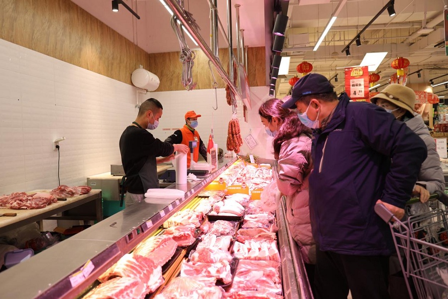 在蔬菜區(qū)、水產(chǎn)區(qū)、肉類區(qū),工作人員稱重、打包,忙得不亦樂乎。“今天一大早就有不少群眾來,各種肉類和火鍋食材賣得很快,還有顧客一次性買了800多元的肉卷。大家都說要多買點菜,好好吃頓火鍋。我們工作人員現(xiàn)場切肉、殺魚,也是忙得不可開交。”該超市一汪姓負責(zé)人表示,從上午的情況看,群眾購買商品的意愿都很強,大家對各類商品的需求都很大。
