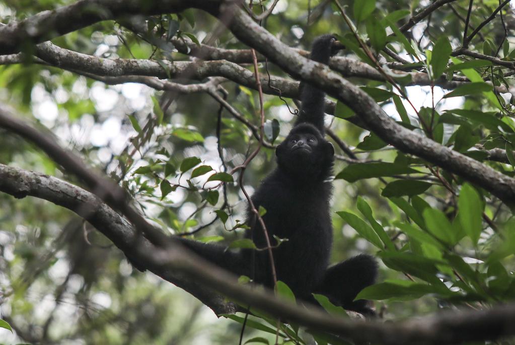這是在海南霸王嶺自然保護(hù)區(qū)內(nèi)拍攝的海南長臂猿(2019年10月25日拍攝)。新華社記者 蒲曉旭 攝