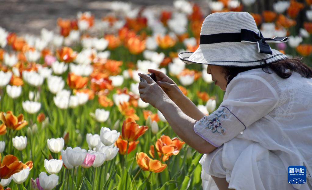 4月19日,游人在北臧村鎮(zhèn)永定河畔的綠色港灣內(nèi)拍攝盛開的郁金香。