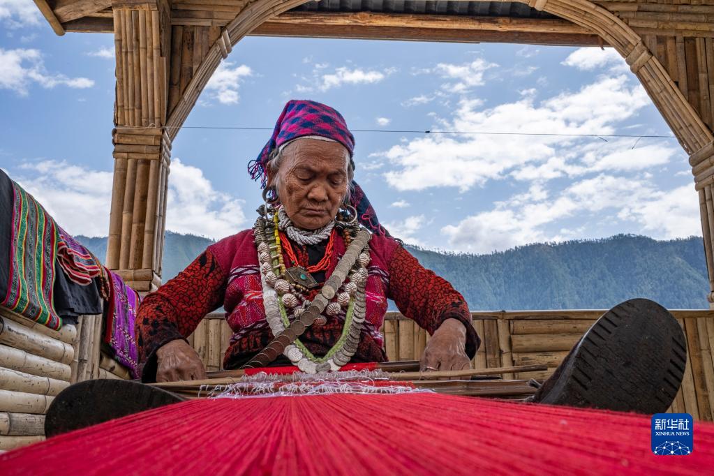 今年72歲的本央老人,是僜人服飾制作技藝西藏自治區(qū)級(jí)非遺傳承人。在西藏林芝市察隅縣沙瓊村,老人身著傳統(tǒng)的僜人服飾,在自家的涼亭里編織布料。