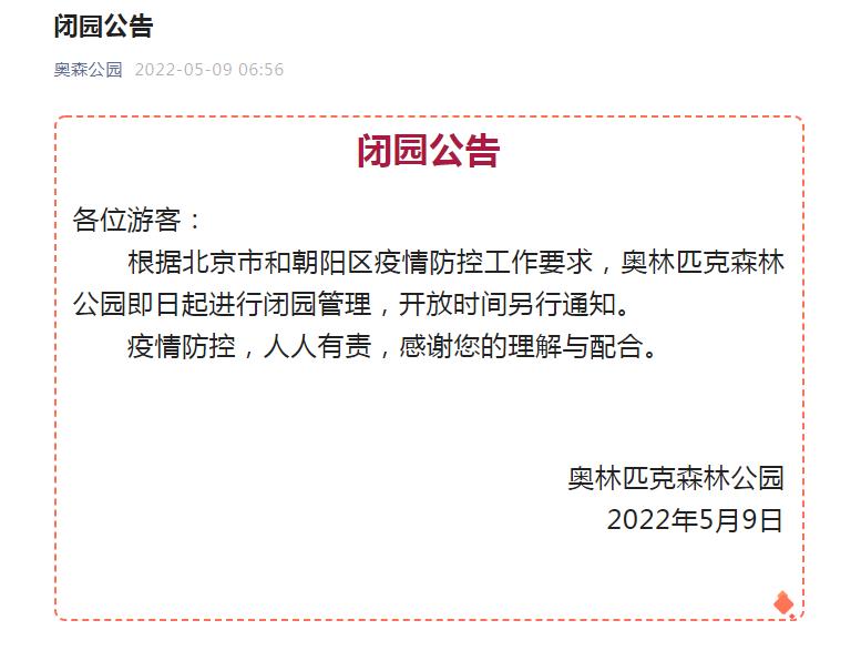 “奧森公園”微信公眾號9日發(fā)布閉園公告,根據(jù)北京市和朝陽區(qū)疫情防控工作要求,奧林匹克森林公園即日起進(jìn)行閉園管理,開放時間另行通知。