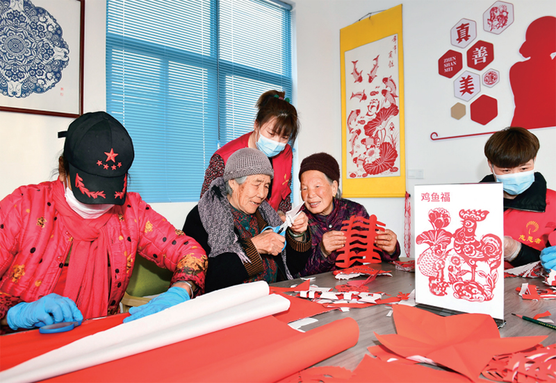山東省日照市嵐山區(qū)按照就近、普惠原則建設(shè)養(yǎng)老服務(wù)中心,并組建志愿服務(wù)隊為老人提供助餐、助潔、助醫(yī)等愛心服務(wù)。圖為2022年2月27日,志愿者在日照市嵐山區(qū)虎山鎮(zhèn)黃家峪村養(yǎng)老服務(wù)中心陪老人剪紙、聊天。 新華社記者 郭緒雷/攝