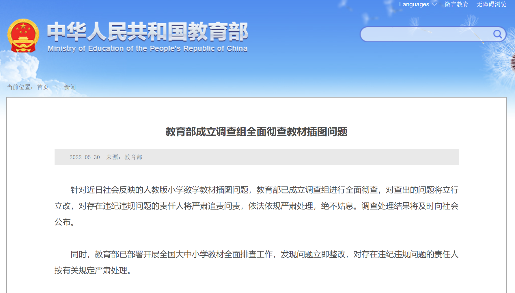 針對近日社會反映的人教版小學(xué)數(shù)學(xué)教材插圖問題,教育部已成立調(diào)查組進行全面徹查,對查出的問題將立行立改,對存在違紀違規(guī)問題的責(zé)任人將嚴肅追責(zé)問責(zé),依法依規(guī)嚴肅處理,絕不姑息。調(diào)查處理結(jié)果將及時向社會公布。