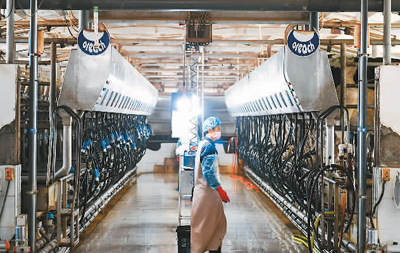 近年來,內(nèi)蒙古自治區(qū)巴彥淖爾市臨河區(qū)干召廟鎮(zhèn)依托當(dāng)?shù)貎?yōu)勢大力發(fā)展養(yǎng)牛產(chǎn)業(yè),采取“支部+合作社+基地+農(nóng)戶”的發(fā)展模式,帶動農(nóng)戶發(fā)展養(yǎng)牛產(chǎn)業(yè),促進農(nóng)戶增收致富,助力鄉(xiāng)村振興。圖為1月19日,巴彥淖爾市臨河區(qū)東鑫奶牛養(yǎng)殖專業(yè)合作社擠奶車間。貝 赫攝(新華社發(fā))