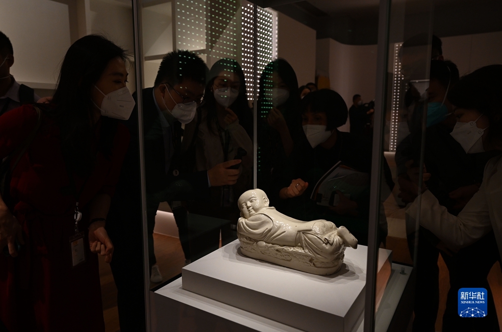 這是即將展出的北宋定窯白釉孩兒枕(6月9日攝)。新華社記者金良快攝