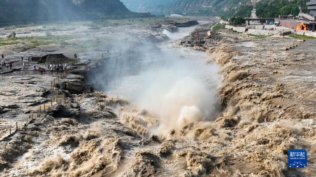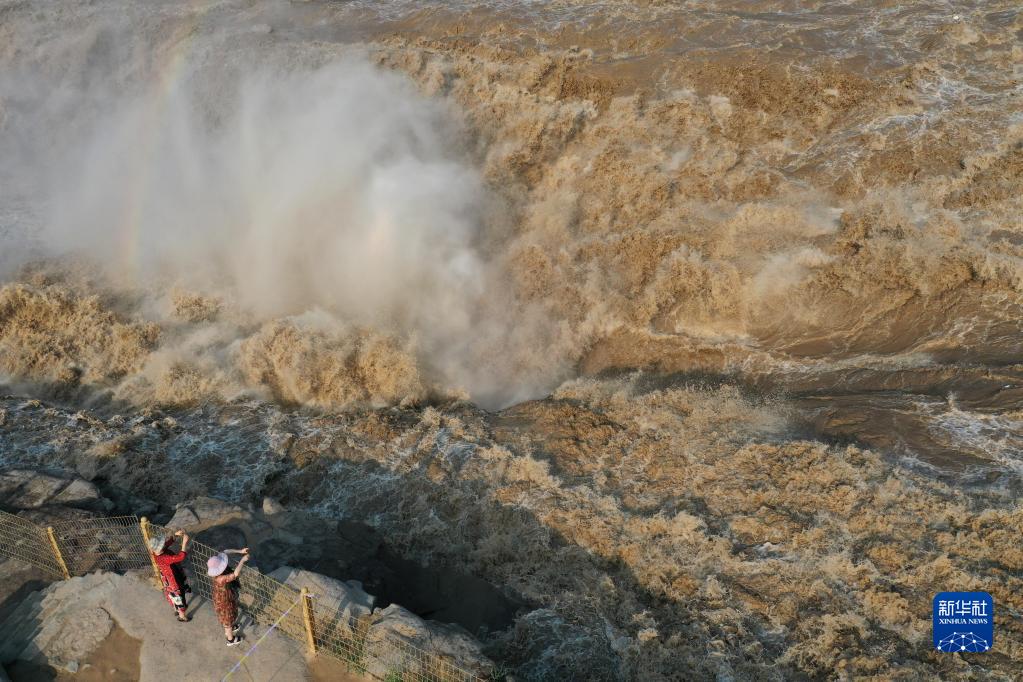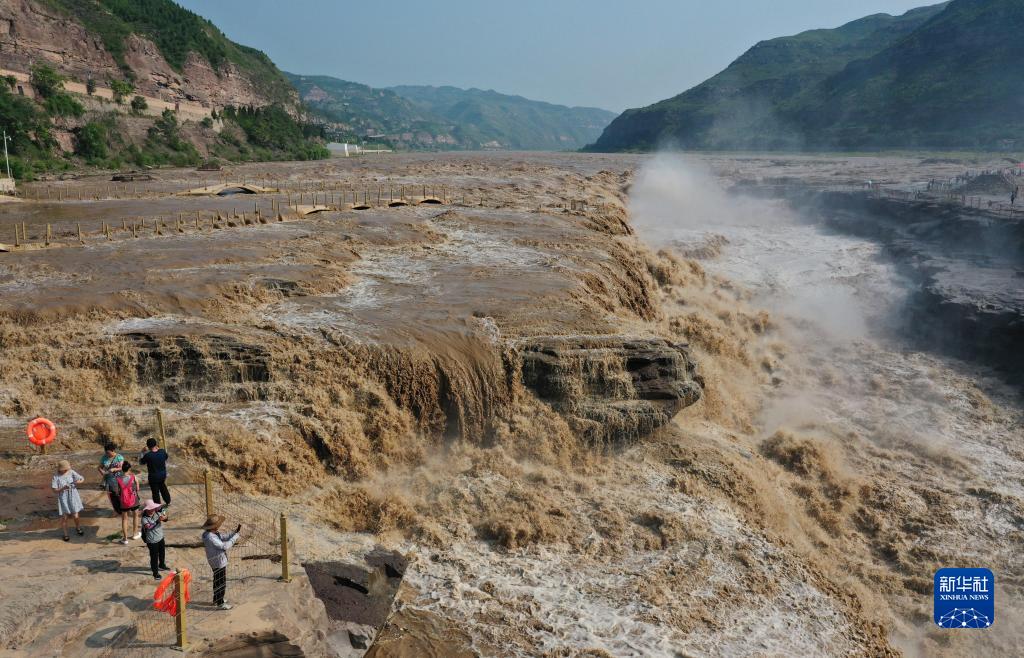 7月4日,游客在黃河壺口瀑布景區(qū)觀瀑(無人機(jī)照片)。新華社發(fā)(劉宏達(dá)攝)