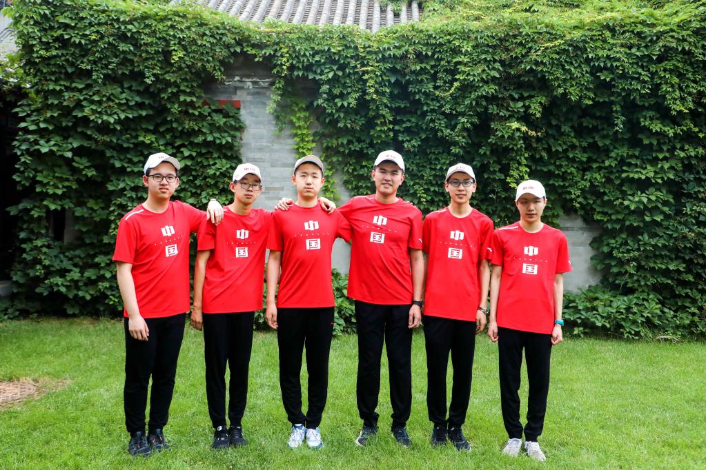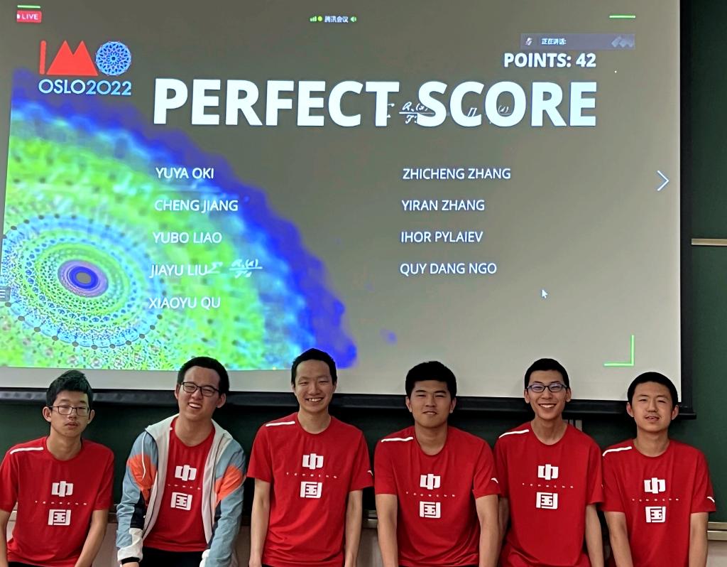 圖為中國數(shù)學(xué)奧林匹克國家隊(duì)6名隊(duì)員在成績(jī)屏前合影。