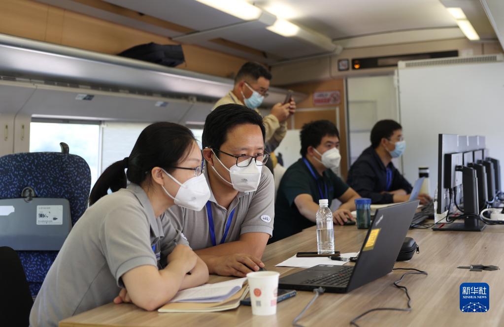 8月23日,工作人員在彌蒙高鐵綜合檢測車內工作。新華社發(fā)(何呂鵬 攝)