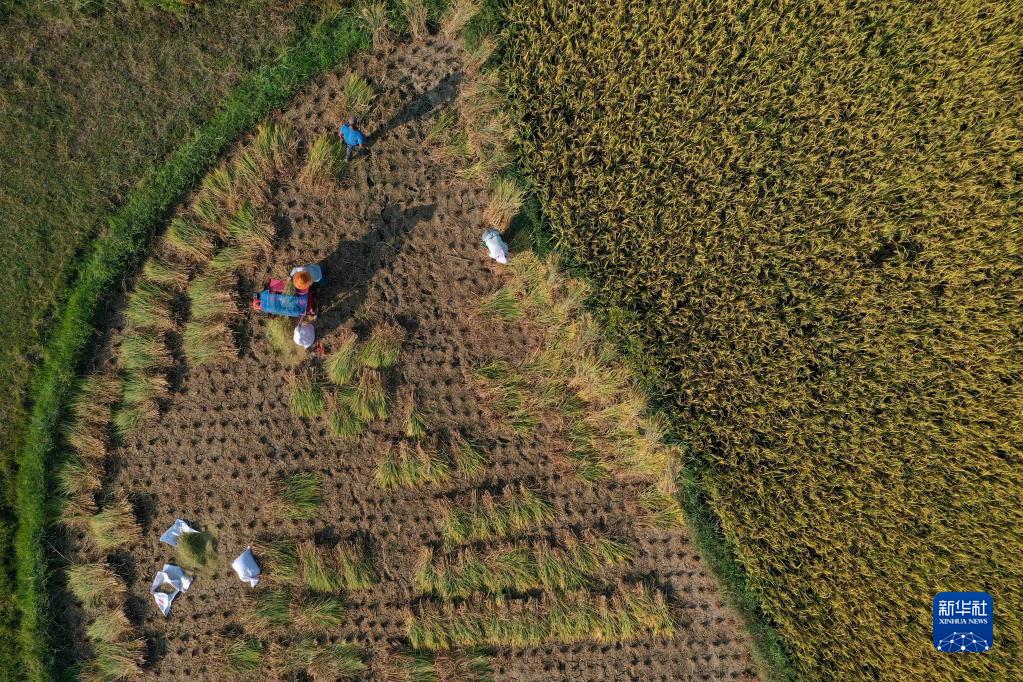 9月1日,村民在貴州省黔東南苗族侗族自治州丹寨縣興仁鎮(zhèn)燒茶村稻田里收割水稻(無(wú)人機(jī)照片)。新華社發(fā)(黃曉海 攝)