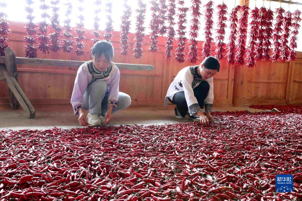 9月1日,在貴州省榕江縣平陽(yáng)鄉(xiāng)硐里村,村民在晾曬朝天椒。新華社發(fā)(李長(zhǎng)華 攝)